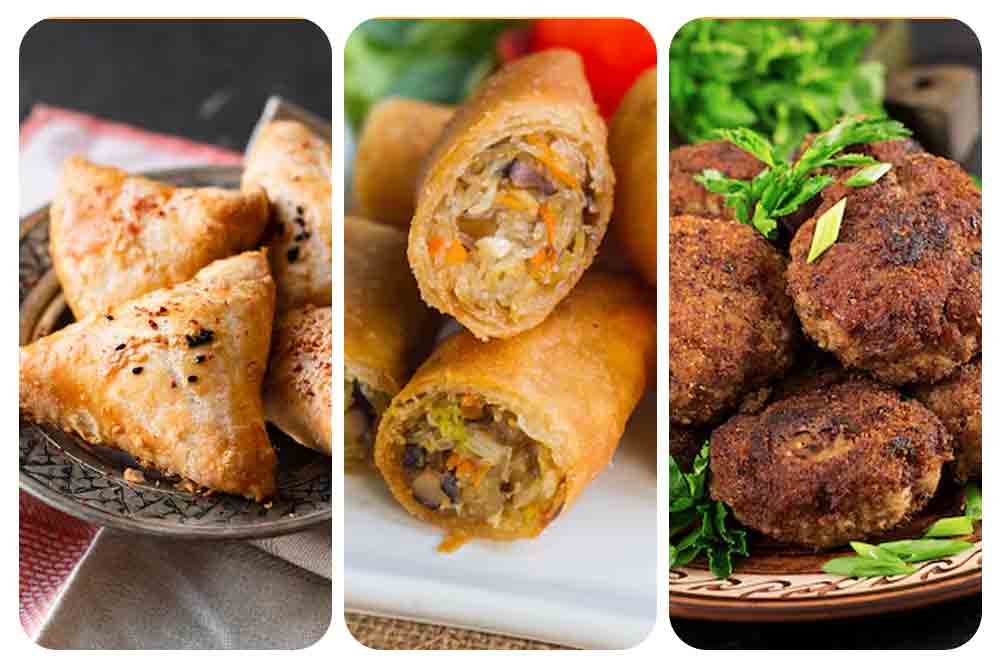 Dry snacks like samosas, spring rolls, cutlets