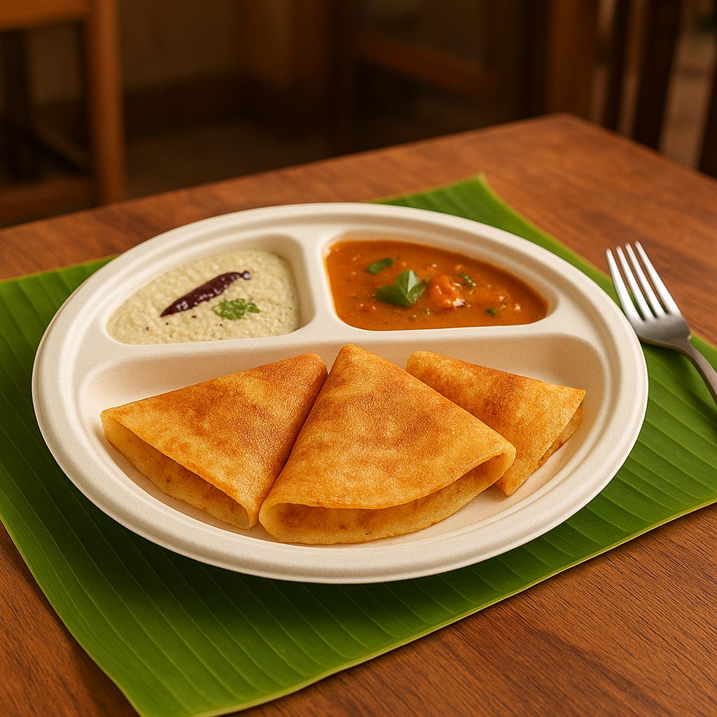 The 9” bagasse plate can comfortably hold up to 500–600 grams of food without bending — including rice meals, snacks, or stacked servings.